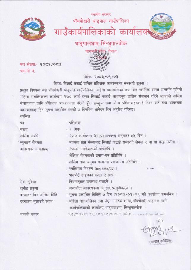 सिलाई कटाई तालिम प्रशिक्षक आवश्यकता सम्बन्धी सूचना ।